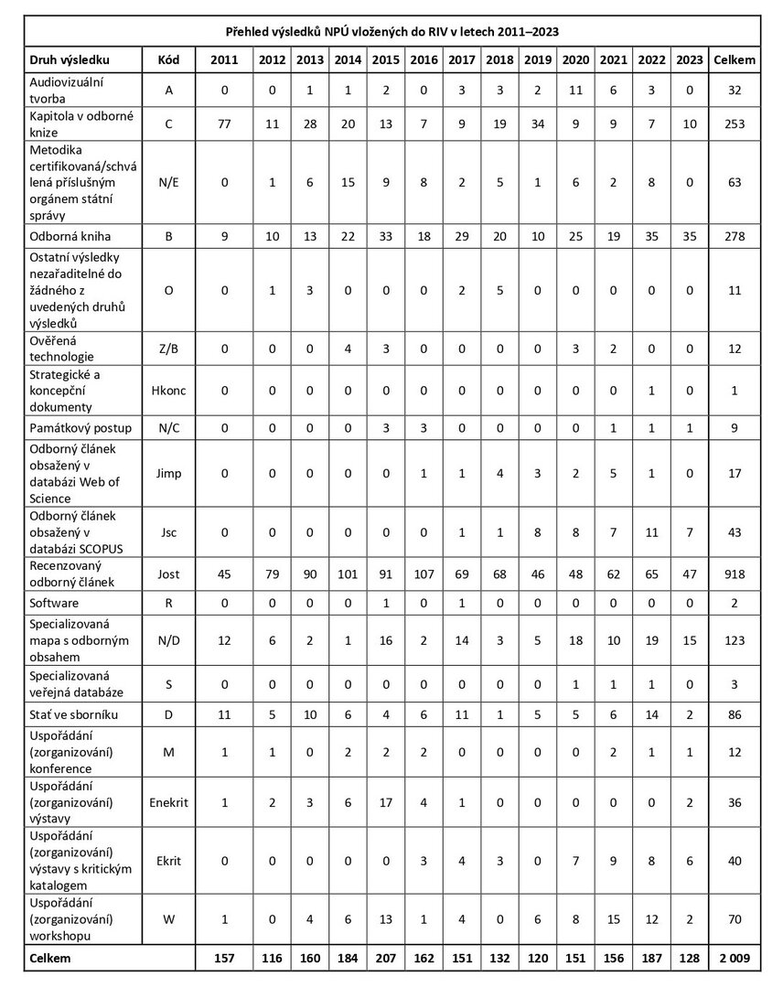Přehled výsledků NPÚ vložených do RIV v letech 2011–2023: