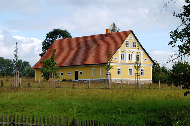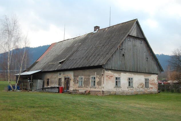 Starší dřevěné stavby byly v době kolem poloviny 19. století masivně přezdívány pod vlivem stále se zpřísňujících protipožárních nařízení (úplný zákaz dřevěných staveb byl vydán v roce 1816) a dále pod vlivem klasicistních přestaveb měšťanských domů v Broumově sužovaném častými požáry. Tvarosloví staveb čerpalo z klasicistního a empírového slohu. Jednotlivé objekty větších usedlostí se oproti dřevěné zástavbě začaly více formovat do čtyřstranných uzavřených usedlostí tzv. dvorců. Hlavní a štítově orientovanou stavbou je vždy obytné stavení hospodáře. Kolmo k ní při uličním průčelí je situován výměnek. Paralelně s obydlím hospodáře a kolmo na něj v zadní části dvora jsou umístěny hospodářské stavby, stodoly nebo kolny. Mezi uličními budovami bývá i vjezdová brána.
