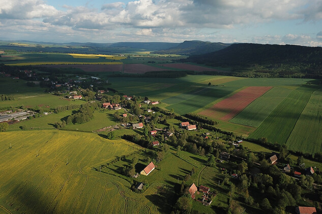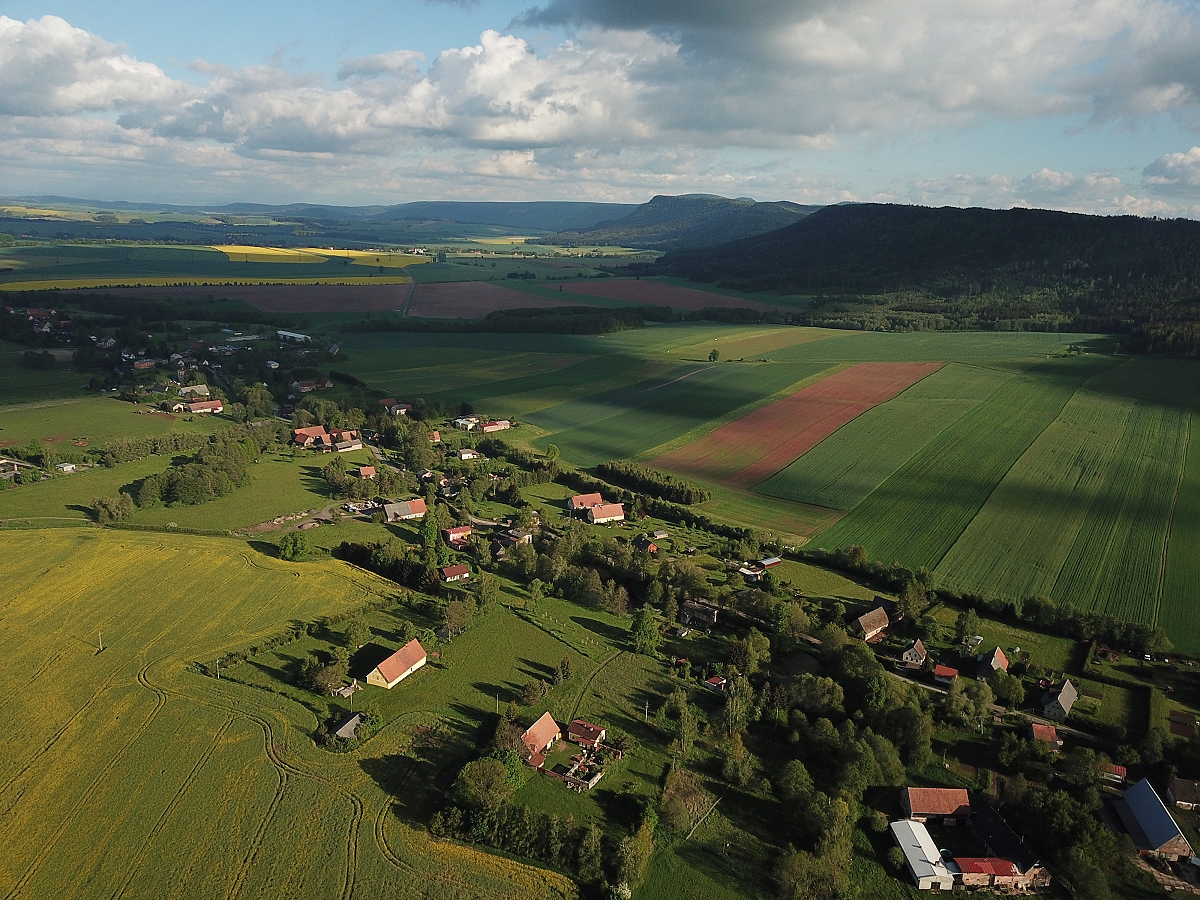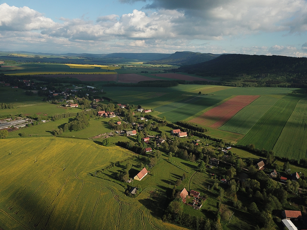 Údolní lánová vesnice táhlého půdorysu má středověký původ. Čtyřstranné dvorce se zděnými domy a hospodářskými objekty z 18. a 19. století, typické pro oblast Broumovska, doplňují starší dřevěné stavby.