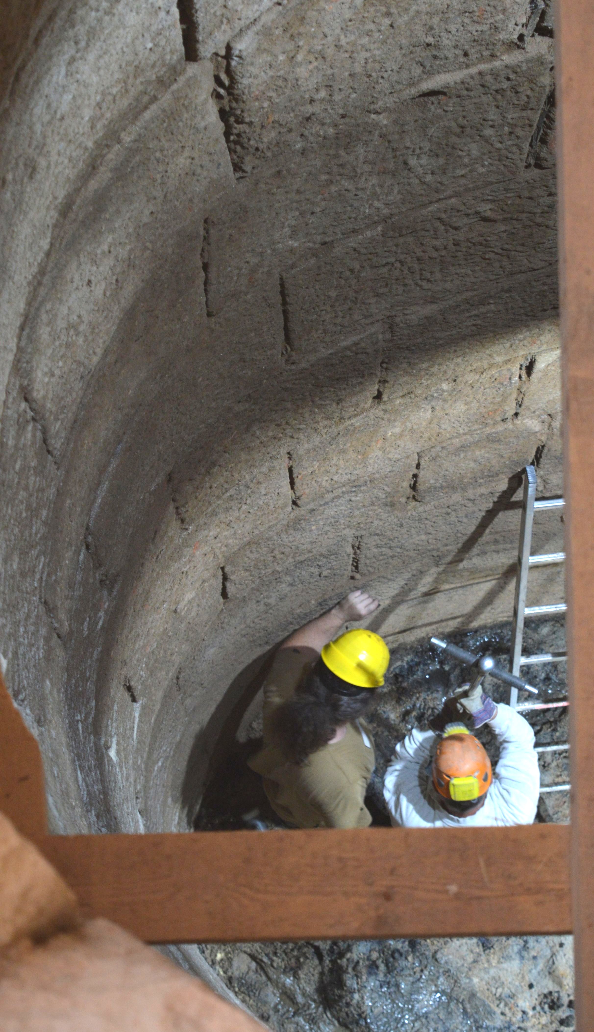 Vlevo zachycen odběr vzorků sondážní tyčí, vpravo odběr vzorků z profilu. Foto: archiv Řehák – SPELEO.
