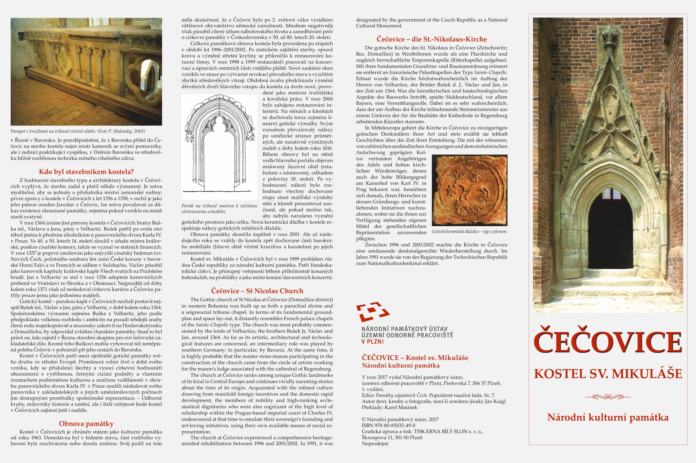 Zjara roku 2017 bylo vydáno sedmé leporelo Čečovice - kostel sv. Mikuláše, národní kulturní památka. Autorem je Jan Kaigl. Publikace zevrubně informuje zejména o ojedinělém typu stavby na způsob panské tribunové kaple, vzdáleně připomínající proslulé gotické kaple typu Sainte-Chapelle ve Francii, a o její mimořádně zdobně bohaté architektuře, inspirované katedrální architekturou v Porýní a v jižním Německu na sklonku 13. století a v 1. polovině 14. století. Zprostředkující uměleckou úlohu sehrála podle všeho stavební huť katedrály v Řezně. Lze s velkou pravděpodobností předpokládat, že dnešní kostel v Čečovicích vznikl v době kolem roku 1364 na náklad bratří Buška ml., Václava a Jana, pánů z Velhartic. V závěrečné kapitole autor stručně pojednává také o průběhu a výsledcích celkové, velmi zdařilé obnovy památky v období let 1996-2001/2002.