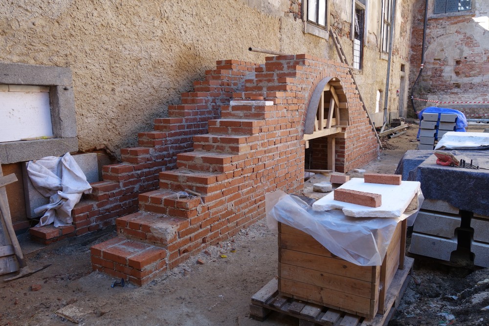 Rajský dvůr – montáž žulových schodišťových stupňů na dvouramenné schodiště. Doplnění soklových desek na fasádách. Montáž lešení na dvorních fasádách Starého a Nového konventu. Prohlídka dvorních fasád a upřesnění technologického postupu oprav – zpevňování dochovaných původních omítek, doplňování nových omítek, oprava říms a kamenických prvků na fasádách.