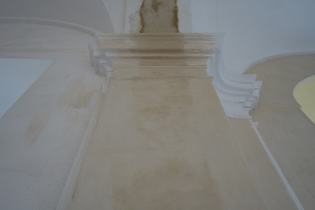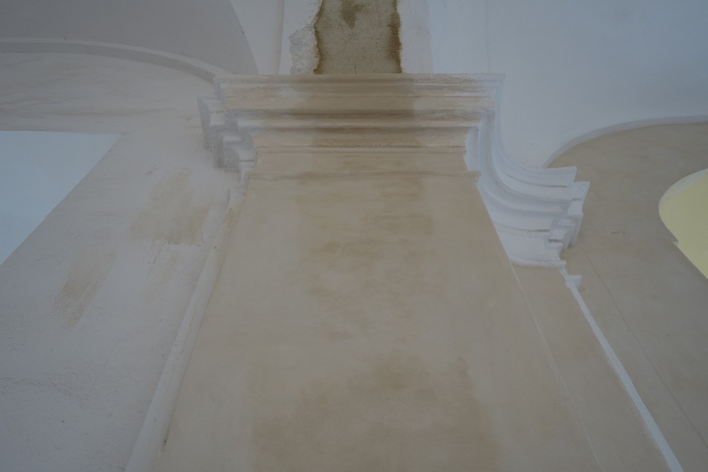 Rajský dvůr – provedení bílého podnátěru kamenného soklu na všech fasádách dvora. Impregnační nátěr cihelné dlažby u kostela v místě původní ambitové chodby.