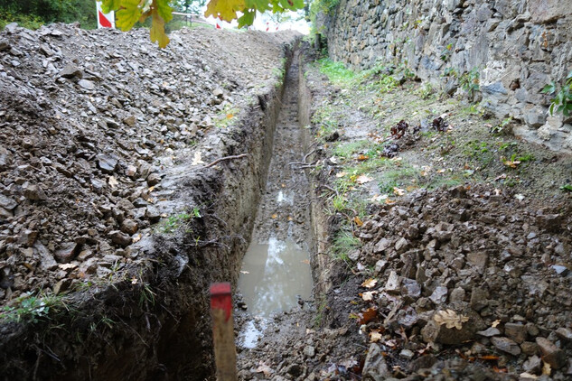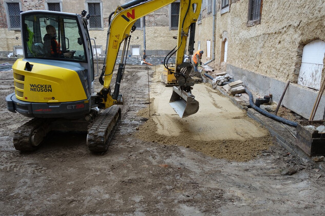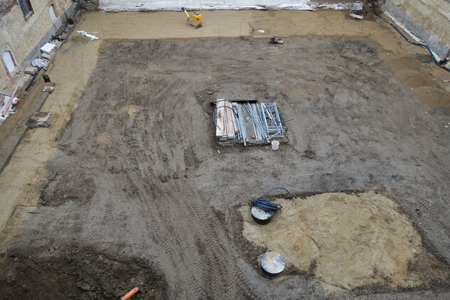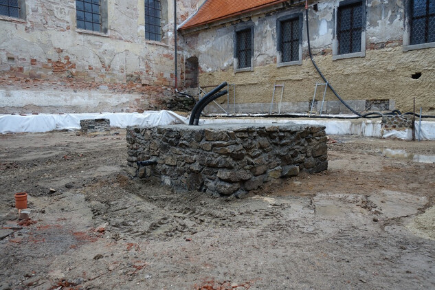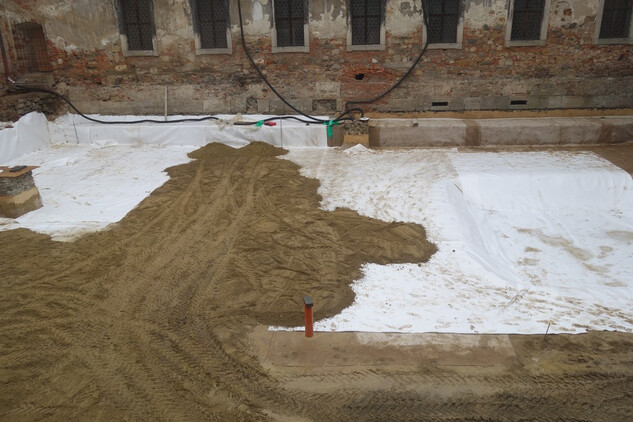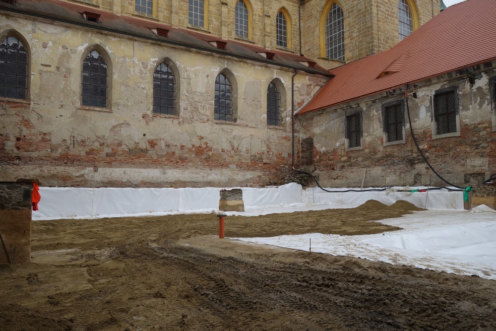 Rajský dvůr – provedeno podkladní lože z písku a jeho urovnání do figury pro následné dláždění okapových chodníků a ambitu u fasády kostela.