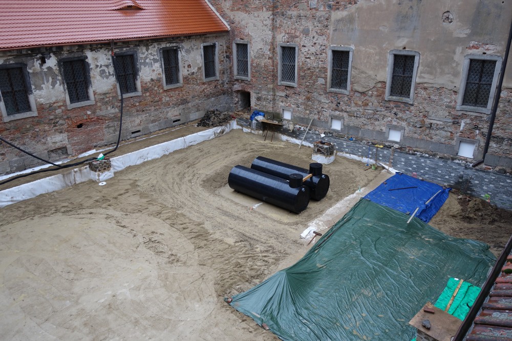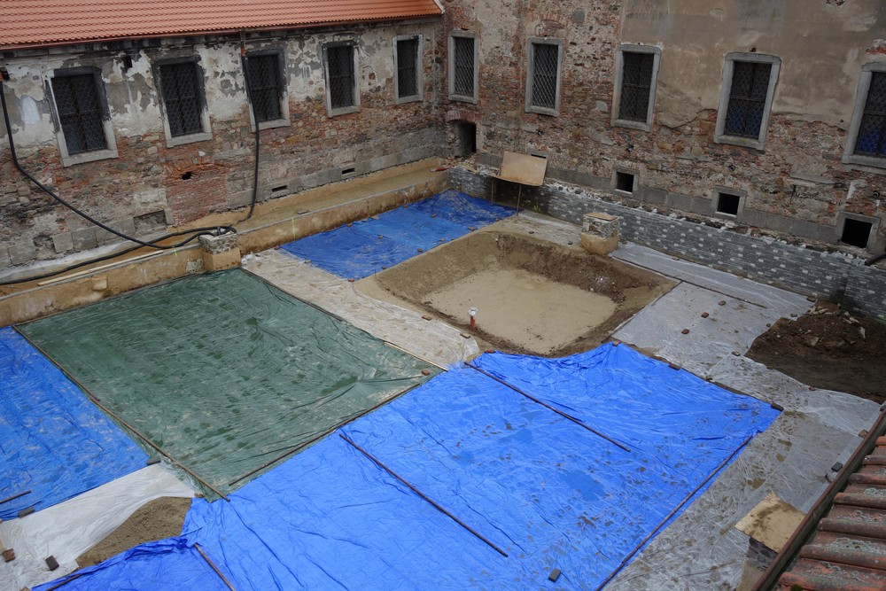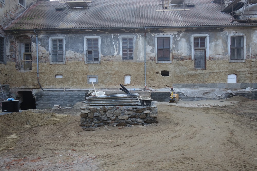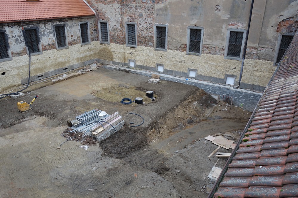 Rajský dvůr – pokračování opravy východní a západní fasády rajského dvora, oprava jižní fasády (Nový konvent). Vzorkování barevnosti fasády schodišťové věže. Pokračování pokládání kamenných okapových chodníků po obvodu dvora.