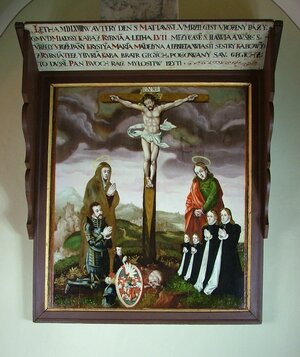 The main motive of both works is a crucifixion, where the deceased members of the family of Kába of Rybnany are on their knees below the crucifix. The border of earthly life here opens up to eternity and therefore gives even to the most tragic fates of the ancient owners a happy dimension, as well as order to the entire place and a sense of our earthly pursuance.
