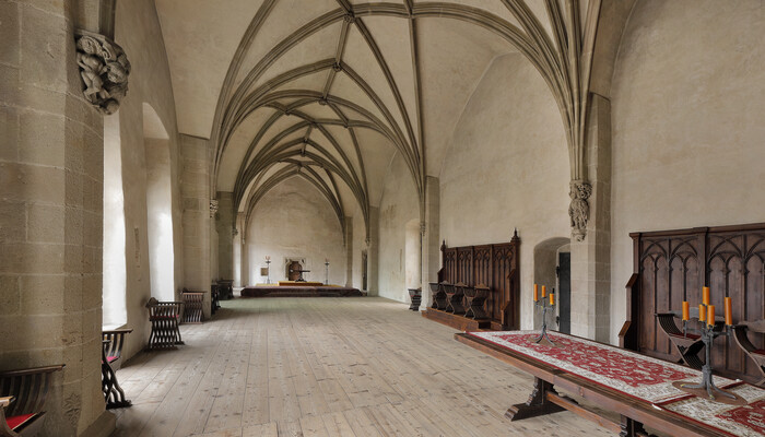 Second castle courtyard, silversmithery, August’s prison, prison, dungeon, chapel, small Knight’s Hall, Large Knight’s (Royal) Hall, library, picture gallery, Fürstenberg Museum.