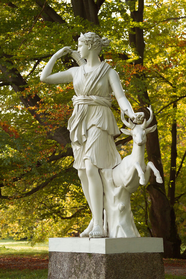 Artemis byla dcera Diova a Leto, sestra Apollonova. Socha je podle nejznámější zachované plastiky Artemis z Versailles. Předpokládá se, že Artemis vyjímá šíp z toulce, aby ochránila laň před pronásledovateli. Socha byla odlita v plasské slévárně knížete Metternicha a v roce 1994 byla restaurována.