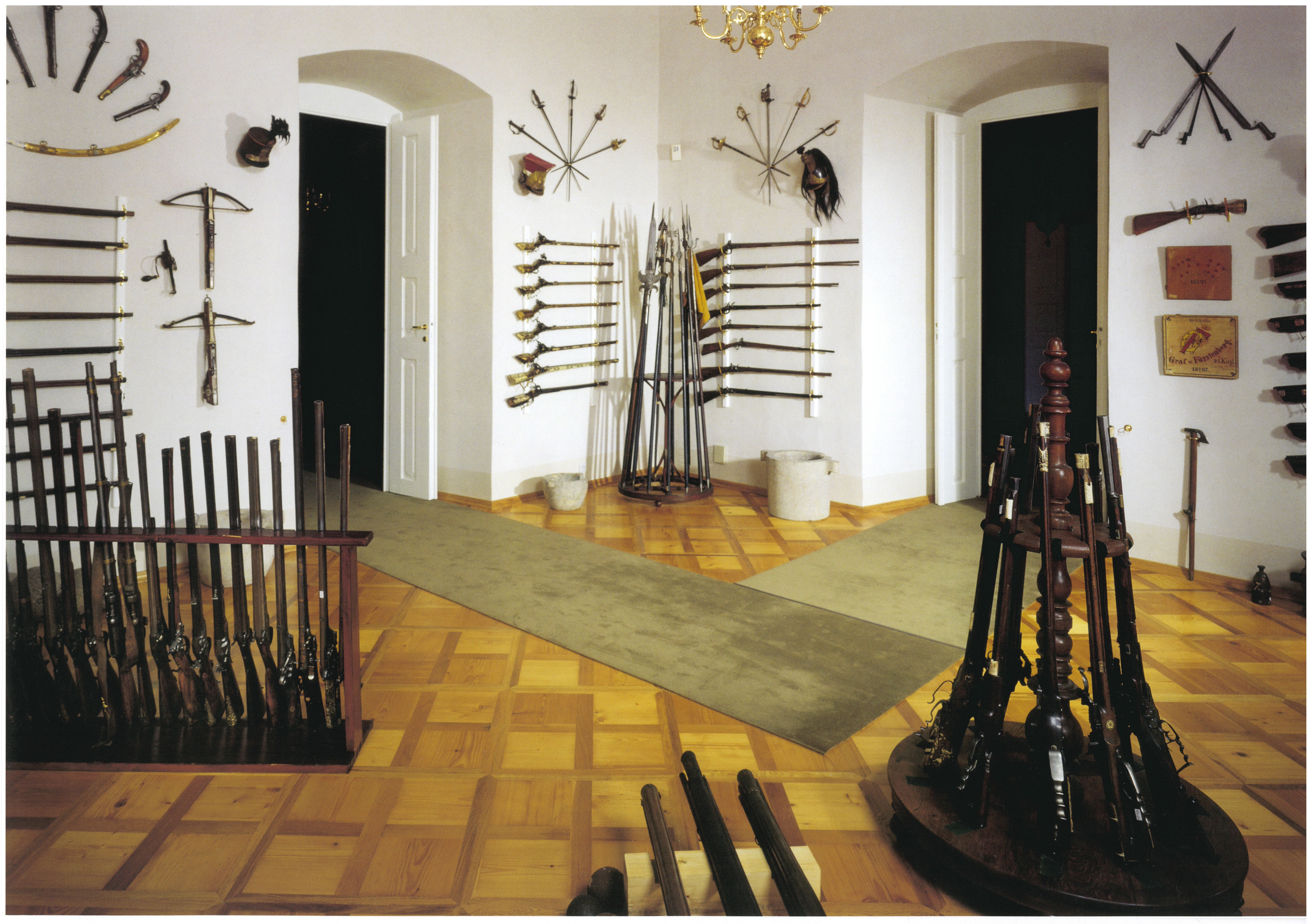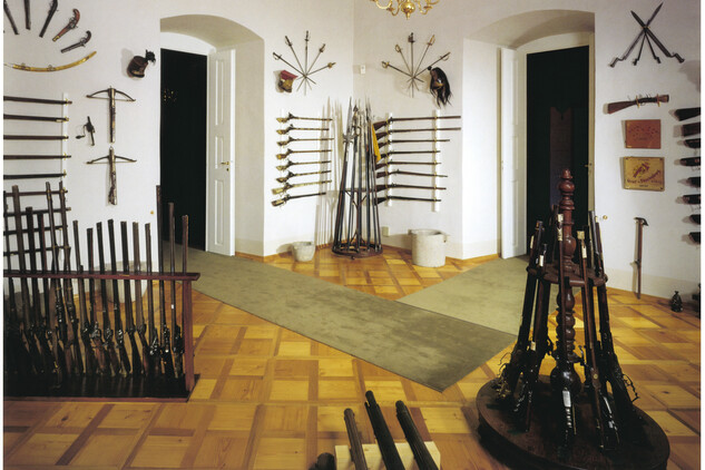 Die Kollektion von Folterinstrumenten beinhaltet Hinrichtungsschwerter des Scharfrichters von Eger (siehe Die Hinrichtung auf der Burg Elbogen), historische Waffen (siehe Jan Zizkas hussitischer Kolben), Sturmhauben, Helme und Mützen wichtiger europäischer Regimente (siehe Die Hallebarden aus dem Ausverkauf).