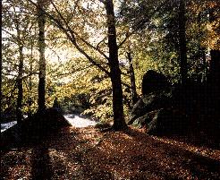 Steuern Sie von Königswart über eine Abkürzung zum Bahnhof, kommen Sie an einem Ort vorbei, der einst als „Irlat“, deutlicher „Erlich“ bezeichnet war – heute würden wir ihn wohl als „Zum Erlenwäldchen“ bezeichnen. Unmöglich können Sie hier einen gewaltigen Granitblock übersehen. Wenn Sie weitergehen, kommen Sie an weiteren, ähnlichen Steinblöcken am Weg zum Haidteich vorbei, der seinen Namen nach dem örlichen kargen Landstrich Haidfelsen erhielt; heute ist dieser Ort als „Bei den Findlingen“ und „Zaječák“ bekannt. Diese Felsen findet man weiter in den Schlosspark hinein. Oberhalb des Schlosses finden Sie diese am Maierberg, dort, wo die Waldkapelle zum Hl. Kreuz, ein Altan sowie ein Teehäuschen stehen. Einige Findlinge wurden in der Vergangenheit so bearbeitet, dass sie mit den eingemeißelten Stufen Aussichtspunkte, die Natursteinwand der Kapelle oder steinerne Aussichtsbänke darstellen.