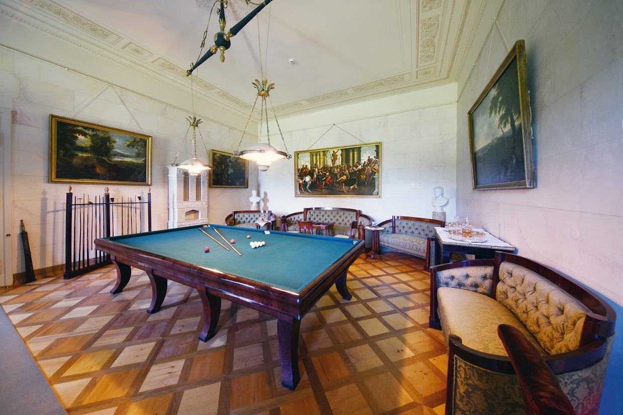 In the castle's dining-hall there is a unique mirror-like table service made of brass and gilded by the Thomire company in Paris in the late 18th century. This luxurious service was presented to Prince Richard Metternich.