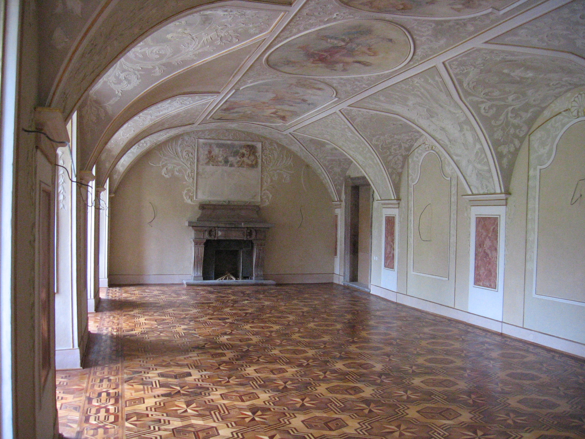 Around 1740 stucco was added to the vaults of the smaller hall under Johann Ferdinand Kager von Globen (1721–47), and ceiling paintings in the 19th century.