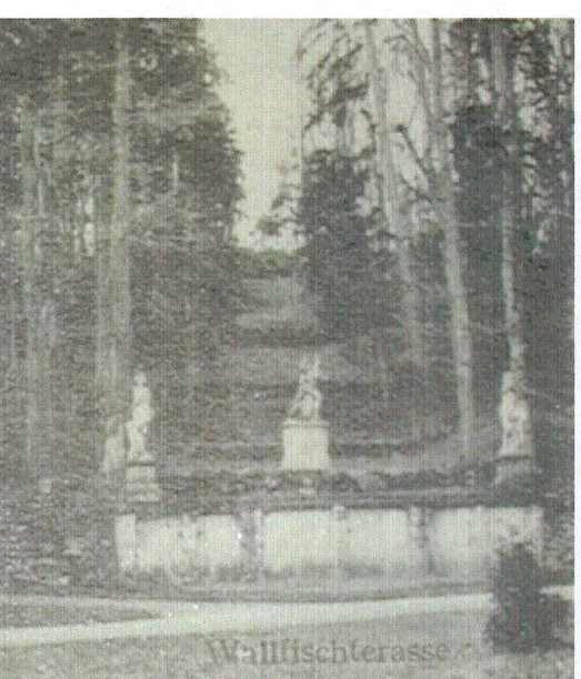 The park is enclosed by trompe l‘oeil gates to the west of the complex. The radial composition of the park is well captured in the first ‘military’ map from 1780–3. During the transformation of the Baroque garden to an ‘English park‘ at the end of the 18th century and beginning of the 19th century by the Korb von Weidenheim family, there appeared follies such as a theatron (outdoor theatre in Greek style), summer house and obelisk.
